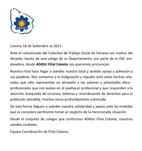 | 19 set 2023 . NOTICIAS DE AUTORIDADES, COMISIONES DE TRABAJO Y FILIALES : Ante el comunicado del Colectivo de Trabajo Social de Soriano con motivo del despido injusto de una colega de su Departamento, por parte de la OSC empleadora, desde ADASU Filial Colonia nos queremos pronunciar | ||||