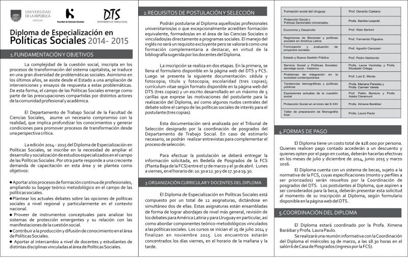 Diploma de Especialización en Políticas Sociales 19 mar 2014 . CURSOS, POSGRADOS, MAESTRIAS : Informes e inscripciones: Bedelia de Posgrados de la FCS (Hall central), entre el 17 de marzo y el 30 de abril, de lunes a viernes en el horario de 10:30 a 12:30 y 17:30 a 19:30