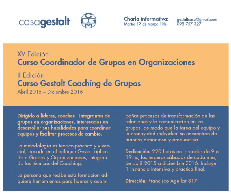 Los invitamos a la formación de Coordinador de Grupos en Organizaciones (XV Edición) y Gestalt Coaching de Grupos (​​I​​I​ ​​​Edición) que comienza el sábado ​18 de ​Abril 201​5.