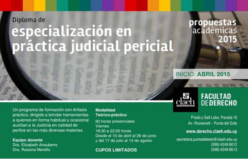 Diploma Especialización-práctica judicial pericial 10 mar 2015 . CURSOS, POSGRADOS, MAESTRIAS : Facultad de Derecho CLAEH sede Punta del Este - Maldonado.