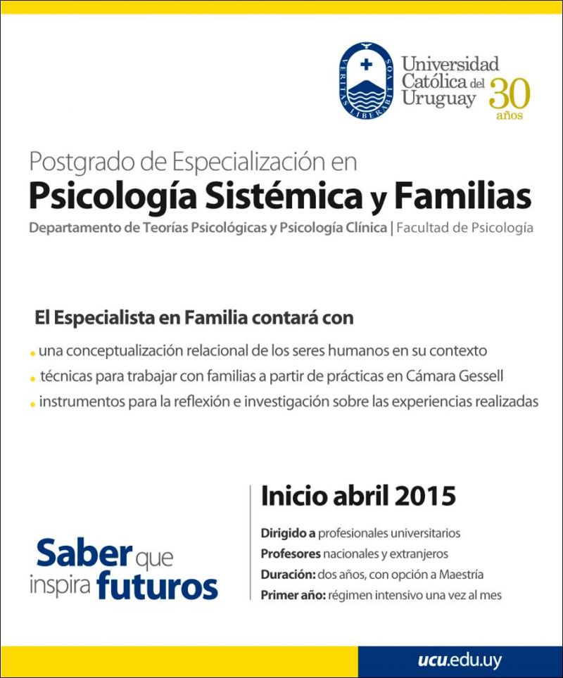 Posgrado en Psicología Sistémica y Familias. 12 mar 2015 . CURSOS, POSGRADOS, MAESTRIAS : Facultad de Psicología de la Universidad Católica.
