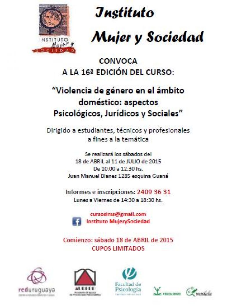 Recordatorio! Curso violencia de género. 26 mar 2015 . CURSOS, POSGRADOS, MAESTRIAS : "Violencia de género en el ámbito doméstico: aspectos psicológicos, jurídicos y sociales". Instituto Mujer y Sociedad.