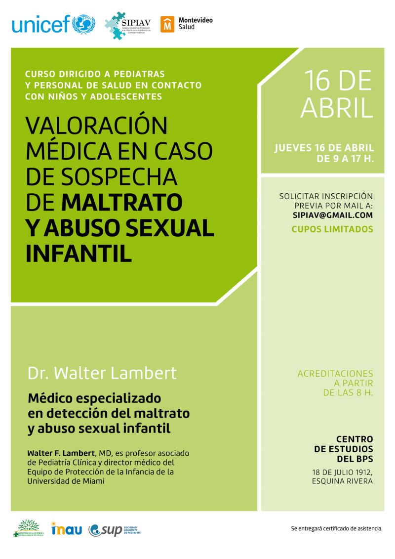 Curso: valoración médica en caso de maltrato 10 abr 2015 . CURSOS, POSGRADOS, MAESTRIAS : Dirigido a pediatras y personal de salud en contacto con niños y adolescentes.