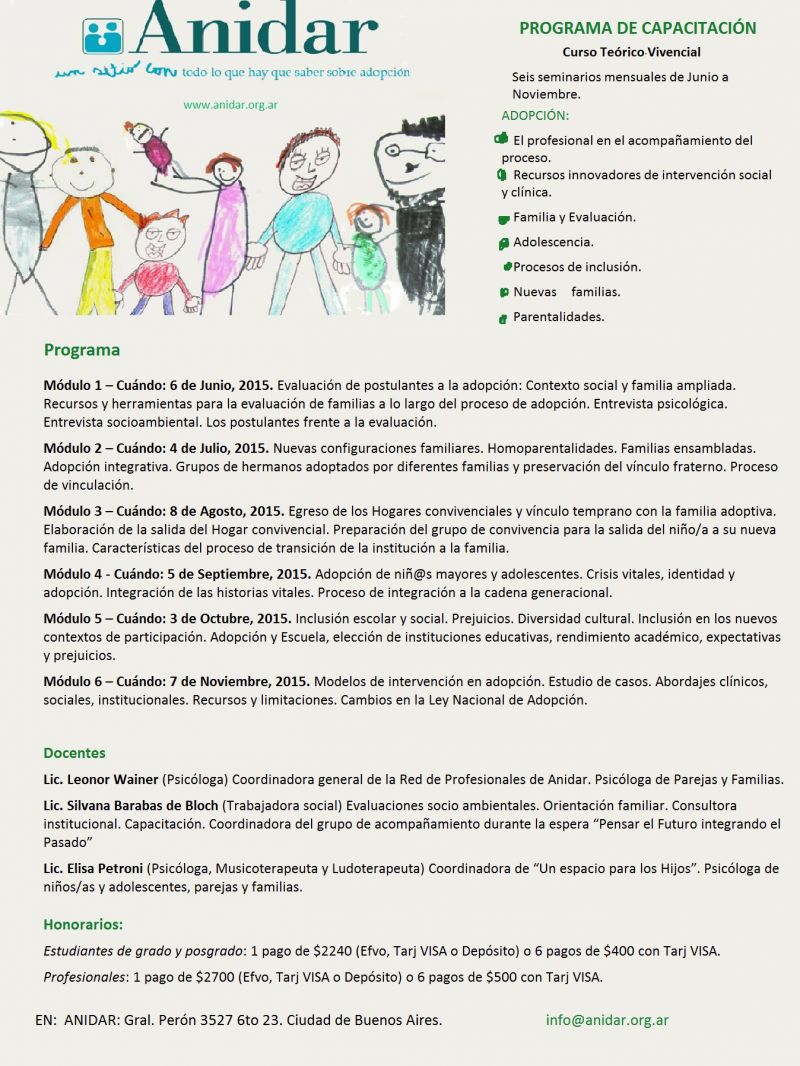 Módulo 1 – Cuándo: 6 de Junio, 2015. Evaluación de postulantes a la adopción: Contexto social y familia ampliada. Recursos y herramientas para la evaluación de familias a lo largo del proceso de adopción. Entrevista psicológica. Entrevista socioambiental. Los postulantes frente a la evaluación. Módulo 2 – Cuándo: 4 de Julio, 2015. Nuevas configuraciones familiares. Homoparentalidades. Familias ensambladas. Adopción integrativa. Grupos de hermanos adoptados por diferentes familias y preservación del vínculo fraterno. Proceso de vinculación. Módulo 3 – Cuándo: 8 de Agosto, 2015. Egreso de los Hogares convivenciales y vínculo temprano con la familia adoptiva. Elaboración de la salida del Hogar convivencial. Preparación del grupo de convivencia para la salida del niño/a a su nueva familia. Características del proceso de transición de la institución a la familia. Módulo 4 - Cuándo: 5 de Septiembre, 2015. Adopción de niñ@s mayores y adolescentes. Crisis vitales, identidad y adopción. Integración de las historias vitales. Proceso de integración a la cadena generacional. Módulo 5 – Cuándo: 3 de Octubre, 2015. Inclusión escolar y social. Prejuicios. Diversidad cultural. Inclusión en los nuevos contextos de participación. Adopción y Escuela, elección de instituciones educativas, rendimiento académico, expectativas y prejuicios. Módulo 6 – Cuándo: 7 de Noviembre, 2015. Modelos de intervención en adopción. Estudio de casos. Abordajes clínicos, sociales, institucionales. Recursos y limitaciones. Cambios en la Ley Nacional de Adopción. Lic. Leonor Wainer (Psicóloga) Coordinadora general de la Red de Profesionales de Anidar. Psicóloga de Parejas y Familias. Lic. Silvana Barabas de Bloch (Trabajadora social) Evaluaciones socio ambientales. Orientación familiar. Consultora institucional. Capacitación. Coordinadora del grupo de acompañamiento durante la espera “Pensar el Futuro integrando el Pasado” Lic. Elisa Petroni (Psicóloga, Musicoterapeuta y Ludoterapeuta) Coordinadora de “Un espacio para los Hijos”. Psicóloga de niños/as y adolescentes, parejas y familias.