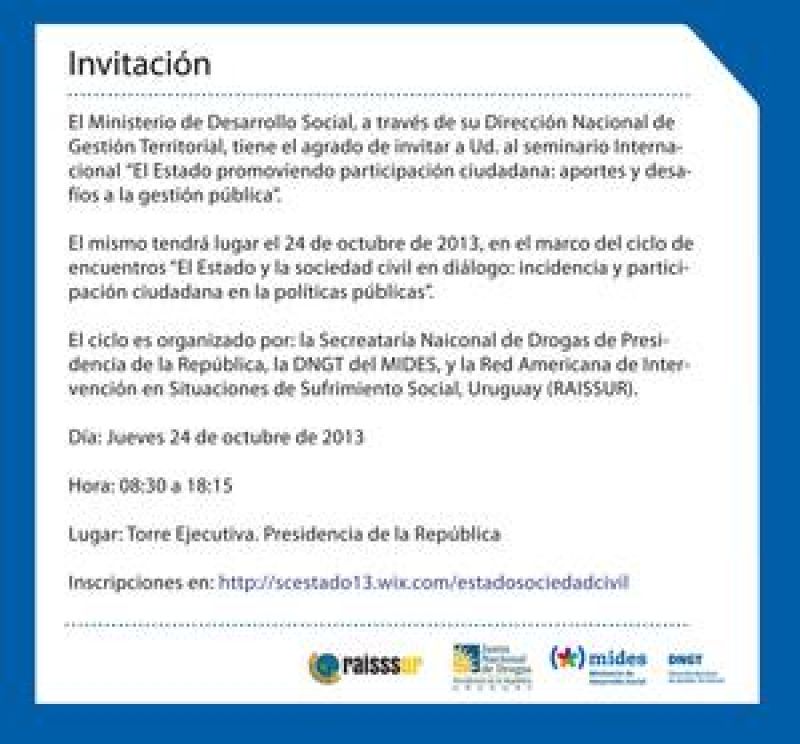 El Estado promoviendo participación ciudadana 20 oct 2013 . SEMINARIOS, JORNADAS, OTROS : Seminario Internacional "El Estado promoviendo participación ciudadana"