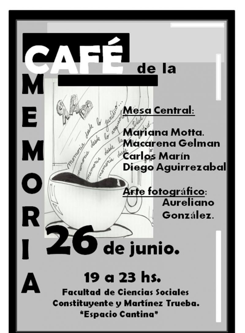 Desde la Coordinación de Trabajo Social se organizó "El café de la memoria". Esta actividad fue realizada en el marco de la Comisión de Carrera del Departamento de Trabajo Social (FCS - UDELAR) y en conjunto con el CECSO (Comisiones de Derecho y de Cultura). Asimismo, cuenta con el aval institucional de Decanato y del Consejo de la Facultad de Ciencias Sociales. Adasu apoyó dicha actividad.