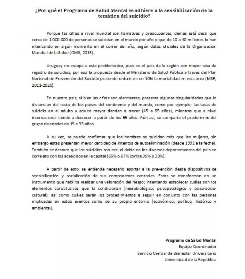 Día Nacional de la Prevención del Suicidio 16 jul 2014 . SEMINARIOS, JORNADAS, OTROS : 17 de JULIO. Día Nacional de la Prevención del Suicidio en el Uruguay.