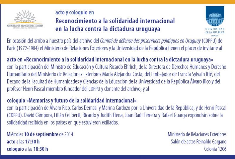 Reconocimiento a la solidaridad RREE 8 set 2014 . SEMINARIOS, JORNADAS, OTROS : Reconocimiento a la solidaridad recibida durante la dictadura / 10 de septiembre / 17:30 / Ministerio RREE