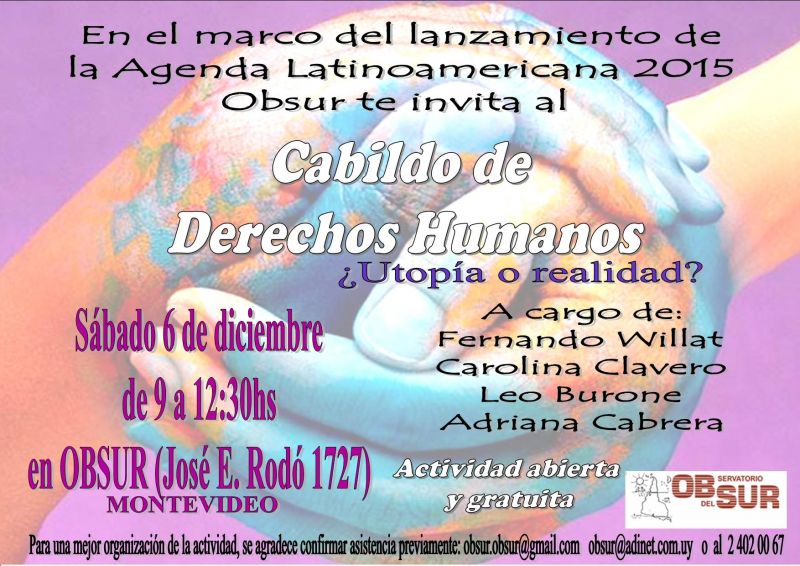 Querido/as amigo/as de Obsur: En el marco del lanzamiento de la Agenda Latinoamericana Mundial 2015 los invitamos al Cabildo de Derechos Humanos ¿Utopía o realidad? que se llevará a cabo el próximo sábado 6 de diciembre de 2014, de 9 a 12.30 hs en Obsur (José E. Rodó 1727 - Montevideo). Pretende