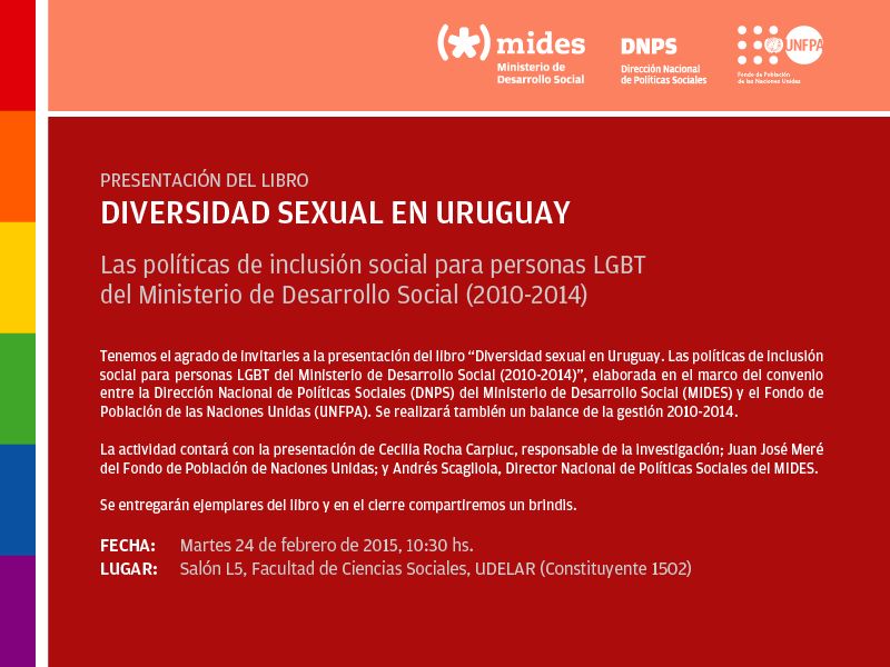 Se invita a la presentación del libro “Diversidad sexual en Uruguay. Las políticas de inclusión social para personas LGBT del Ministerio de Desarrollo Social (2010-2014)”, elaborada en el marco del convenio entre la Dirección Nacional de Políticas Sociales (DNPS) del Ministerio de Desarrollo Social (MIDES) y el Fondo de Población de las Naciones Unidas (UNFPA). Se realizará también un balance de la gestión 2010-2014. La actividad contará con la presentación de Cecilia Rocha Carpiuc, responsable de la investigación; Juan José Meré del Fondo de Población de Naciones Unidas; y Andrés Scagliola, Director Nacional de Políticas Sociales del MIDES. Se entregarán ejemplares del libro y en el cierre compartiremos un brindis. Esperamos contar con su valiosa presencia. FECHA: Martes 24 de febrero de 2015, 10:30 hs. LUGAR: Salón L5, Facultad de Ciencias Sociales, UDELAR (Constituyente 1502) |
