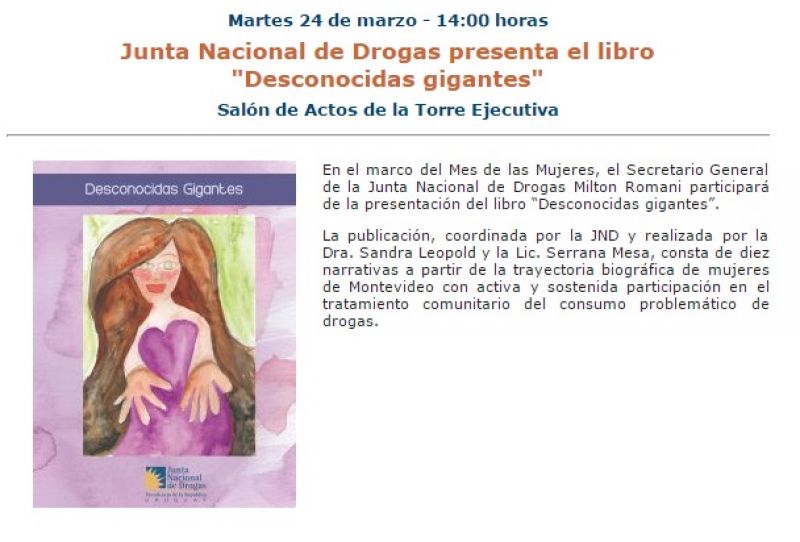 Presentación del libro Desconocidas gigantes 19 mar 2015 . SEMINARIOS, JORNADAS, OTROS : Coordinada por la JND y realizada por la Dra. Sandra Leopold y la Lic. Serrana Mesa.