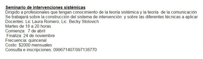 Dirigido a profesionales que tengan conocimiento de la teoría sistémica y la teoría de la comunicación Se trabajará sobre la construcción del sistema de intervención y sobre las diferentes técnicas a aplicar Docentes: Lic Laura Romero, Lic. Becky Stolovich Martes de 18 a 20 horas Comienza: 7 de abril Finaliza: 24 de noviembre Frecuencia: quincenal Costo: $2000 mensuales Consulta e inscripciones: 099 671 407 / 097 138 770 |