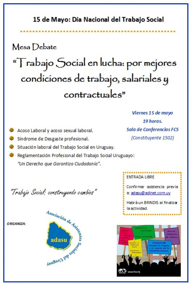 Mesa Debate: "Trabajo Social en Lucha" 23 abr 2015 . SEMINARIOS, JORNADAS, OTROS : "Por mejores condiciones de trabajo, salariales y contractuales". En el marco del Día Nacional del Trabajo Social. Organiza: Adasu.