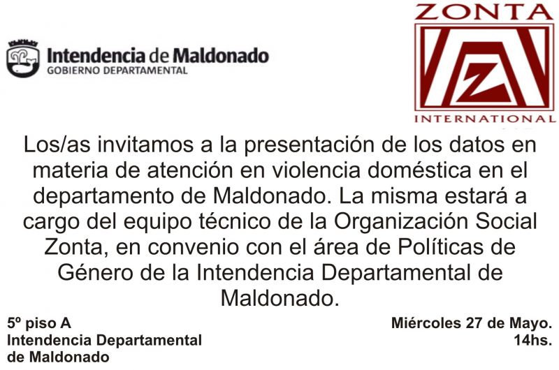 Violencia doméstica en Maldonado. 21 may 2015 . SEMINARIOS, JORNADAS, OTROS : Presentación de datos. Organización Zonta en convenio con Intendencia de Maldonado.