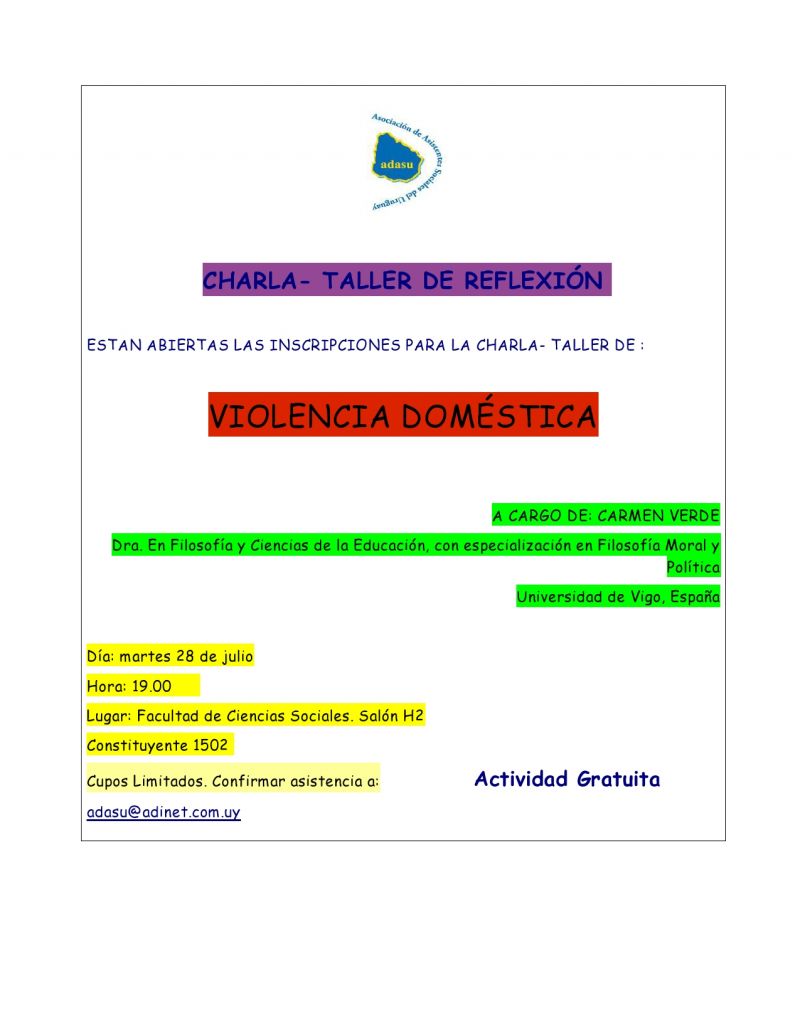 24 jul 2015 . SEMINARIOS, JORNADAS, OTROS : Charla-taller sobre la temática de Violencia Doméstica, dirigida para socios/as de Adasu. La misma estará a cargo de la colega española la Dra. Carmen Verde. Se realizará en Montevideo, Pando, Colonia y San José. Organiza: Adasu
