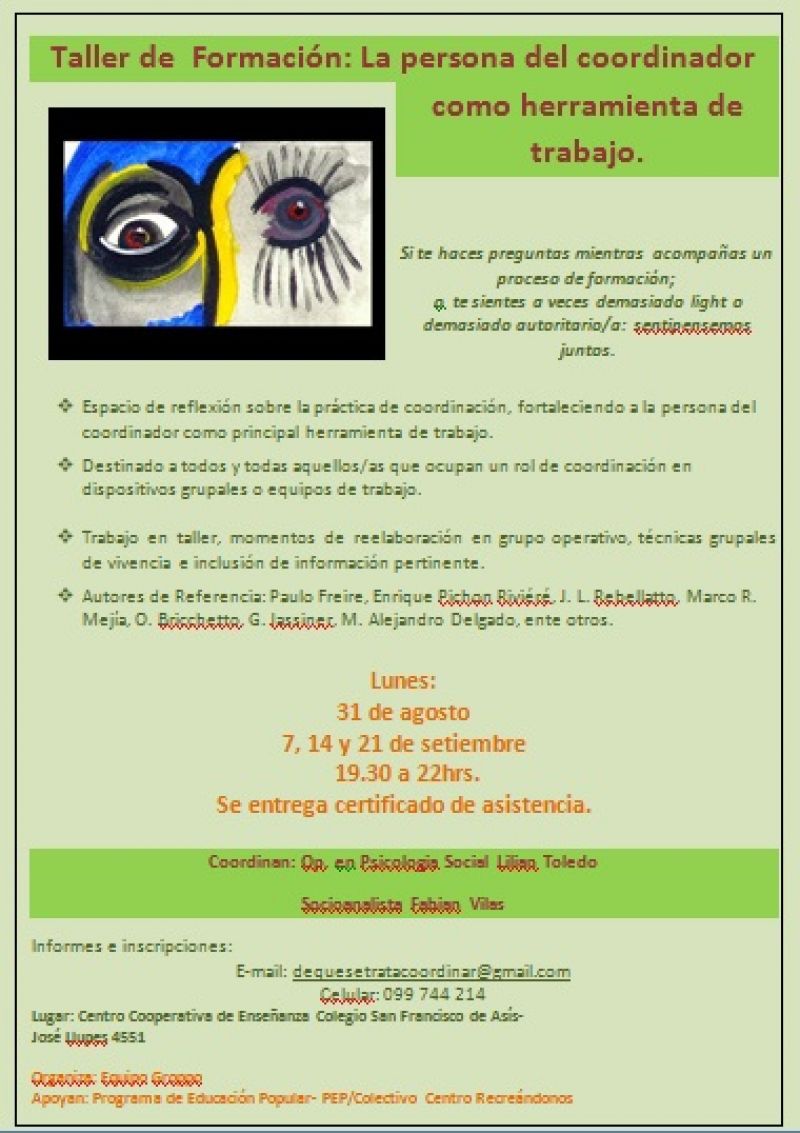 Taller de Formación: "La persona del coordinador como herramienta de trabajo". Destinado a todos y todas aquellos/as que ocupan un rol de coordinación en dispositivos grupales o equipos de trabajo. Trabajo en taller, momentos de reelaboración en grupo operativo, técnicas grupales de vivencia e inclusión de información pertinente. Autores de Referencia: Paulo Freire, Enrique Pichon Riviéré, J. L. Rebellatto, Marco R. Mejía, O. Bricchetto, G. Jassiner, M. Alejandro Delgado, ente otros. Días: Lunes: 31 de agosto, 7, 14 y 21 de setiembre. Horario: 19.30 a 22 hrs. Lugar: Centro Cooperativa de Enseñanza Colegio San Francisco de Asís - José Llupes 4551 Se entregará certificado de asistencia. Coordinan: Op. en Psicologia Social Lilian Toledo y Socioanalista Fabián Vilas. Informes e inscripciones: dequesetratacoordinar@gmail.com Celular: 099 744 214 Organiza: Equipo Groppo Apoyan: Programa de Educación Popular- PEP/Colectivo Centro Recreándonos. |