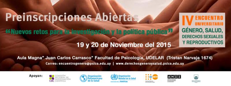 Pre-inscripciones abiertas: IV Encuentro Universitario en Género, Salud, Derechos Sexuales y Derechos Reproductivos que tendrá lugar los días 19 y 20 de noviembre de este año.http://www.derechosgeneroysalud.psico.edu.uy/iv-encuentro