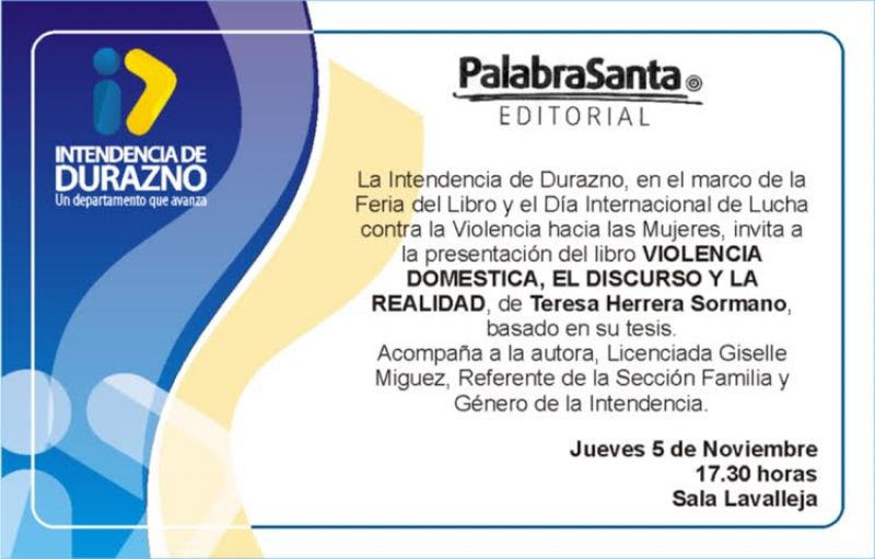 Se realizará en Durazno, el 05 de noviembre a las 17.30 hs, en Sala Lavalleja, en el marco de la Feria del Libro y del Día Internacional de lucha contra la violencia hacia la mujer a presentación del libro de la Soc. Teresa Herrera, "Violencia Doméstica, el discurso y la realidad".