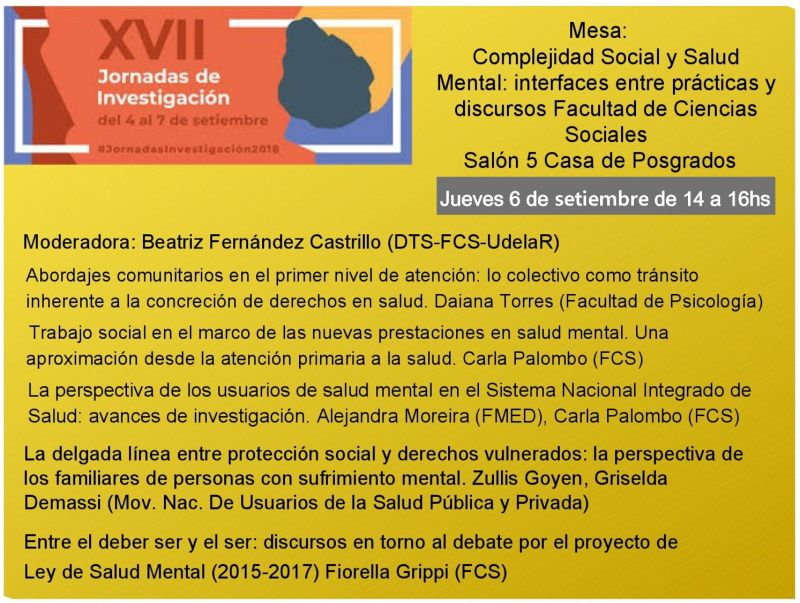 3 set 2018 . SEMINARIOS, JORNADAS, OTROS : Mesa: Complejidad Social y Salud Mental: interfaces entre prácticas y discursos. Facultad de Ciencias Sociales, Salón 5. Jueves 6 de setiembre de 14 a 16hs