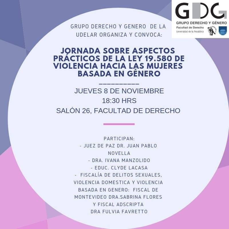Jornada: "Aspectos prácticos sobre la Ley 19. 580" 5 nov 2018 . SEMINARIOS, JORNADAS, OTROS : Grupo de Derecho y Género de la UdelaR, convoca a la Jornada "Aspectos prácticos sobre la Ley 19.580, de violencia hacia las mujeres, basada en género"