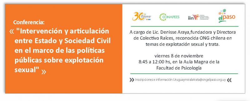 Conferencia sobre la Trata en Uruguay 2 nov 2019 . SEMINARIOS, JORNADAS, OTROS : "Intervención y articulación entre Estado y Sociedad Civil en el marco de las políticas públicas sobre explotación sexual"