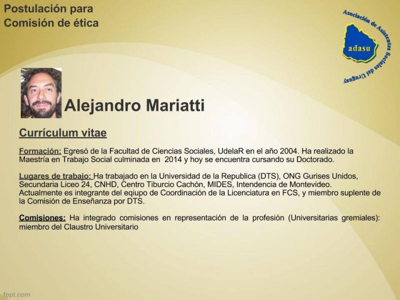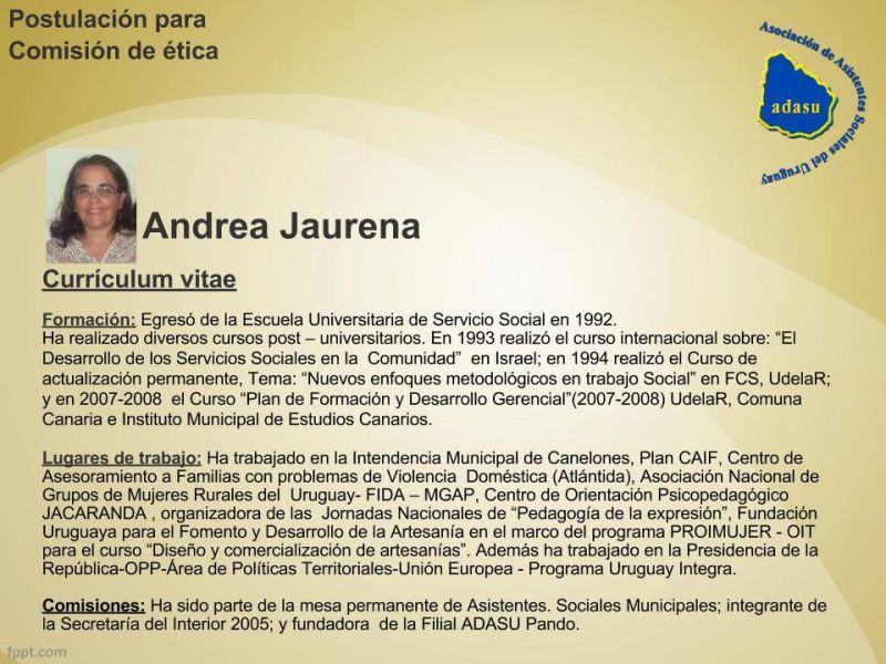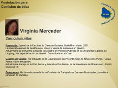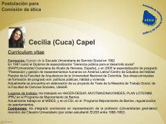 El 28 de octubre del 2015 se realizarán las elecciones de la Comisión de Ética de profesionales de Trabajo social. Te presentamos a los candidatos! Por mayor información del evento:https://www.facebook.com/events/1052015024811628/ Postulantes: 1. Cecilia (Cuca) Capel 2. Virginia Mercader 3. Alejandro Mariatti 4. Andrea Jaurena 5. Dinohora Frigerio