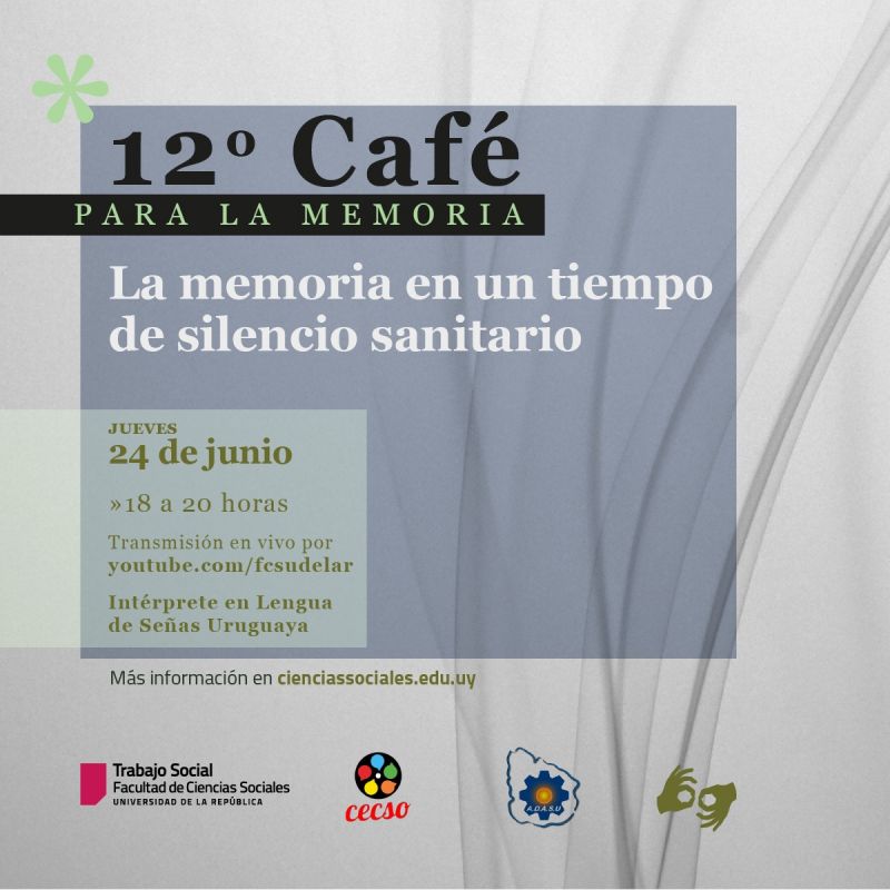 Bajo la consigna «𝙻𝚊 𝚖𝚎𝚖𝚘𝚛𝚒𝚊 𝚎𝚗 𝚞𝚗 𝚝𝚒𝚎𝚖𝚙𝚘 𝚍𝚎 𝚜𝚒𝚕𝚎𝚗𝚌𝚒𝚘 𝚜𝚊𝚗𝚒𝚝𝚊𝚛𝚒𝚘», el Departamento de Trabajo Social (DTS) de la Facultad de Ciencias Sociales (FCS), junto con la Asociación de Asistentes Sociales del Uruguay (Adasu), y el Centro de Estudiantes de Ciencias Sociales (Cecso), invitan a participar de la 12° edición de Café para la memoria.