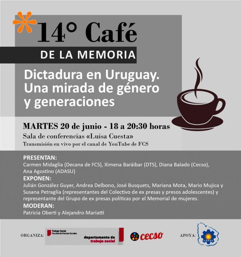horas 14° Café de la memoria «Dictadura en Uruguay. Una mirada de género y generaciones» presentan: Carmen Midaglia (decana de FCS),